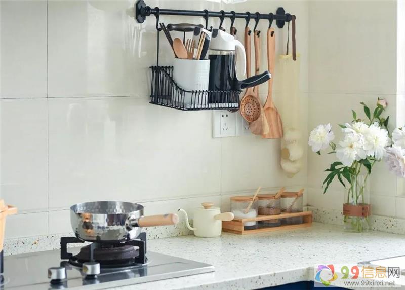 将厨房厨具尽量上墙或者收纳进橱柜,保证台面无物,就能确保厨房整体的简洁,颜值自然就上升啦www.99xinxi.net99信息网。
